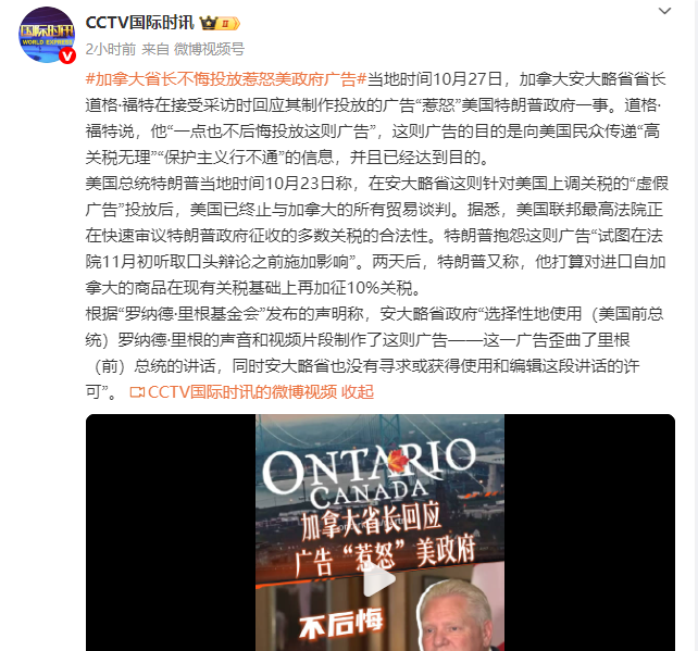 制作的广告“惹怒”特朗普,加拿大省长说:不后悔
