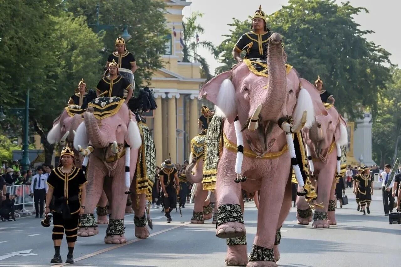 当地时间11月27日,11头粉色大象整齐列队,前往曼谷大皇宫举行悼念仪式,向已故的泰国王太后诗丽吉致敬。
