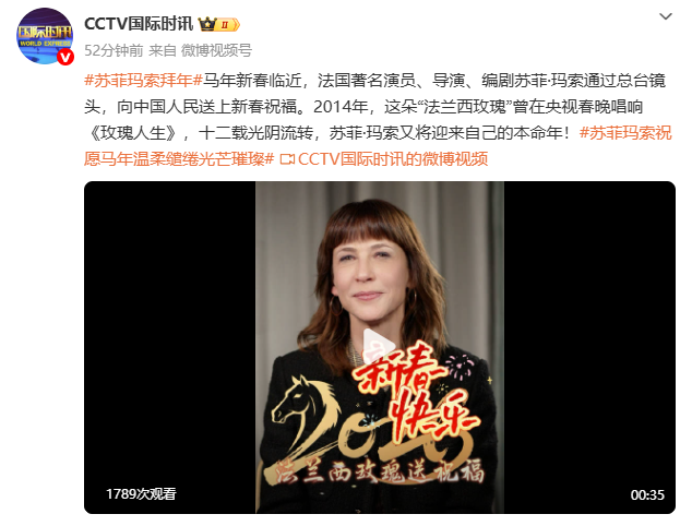 曾在央视春晚唱响《玫瑰人生》的苏菲·玛索,向中国人民拜年