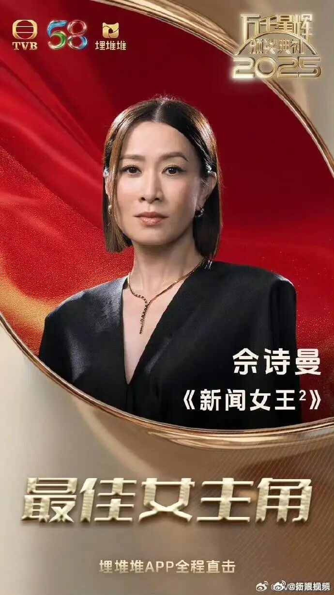 2026年1月4日晚,TVB万千星辉颁奖典礼2025在澳门落幕,佘诗曼凭借《新闻女王2》中文慧心一角,拿下“最佳女主角”奖,也成为TVB有史以来第一个四封“视后”的女演员