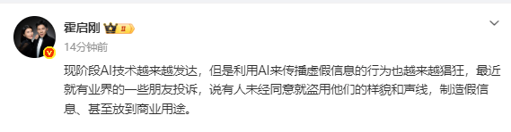 3月23日,霍启刚在个人社交账号上发文,称自己的形象遭到AI盗用。
