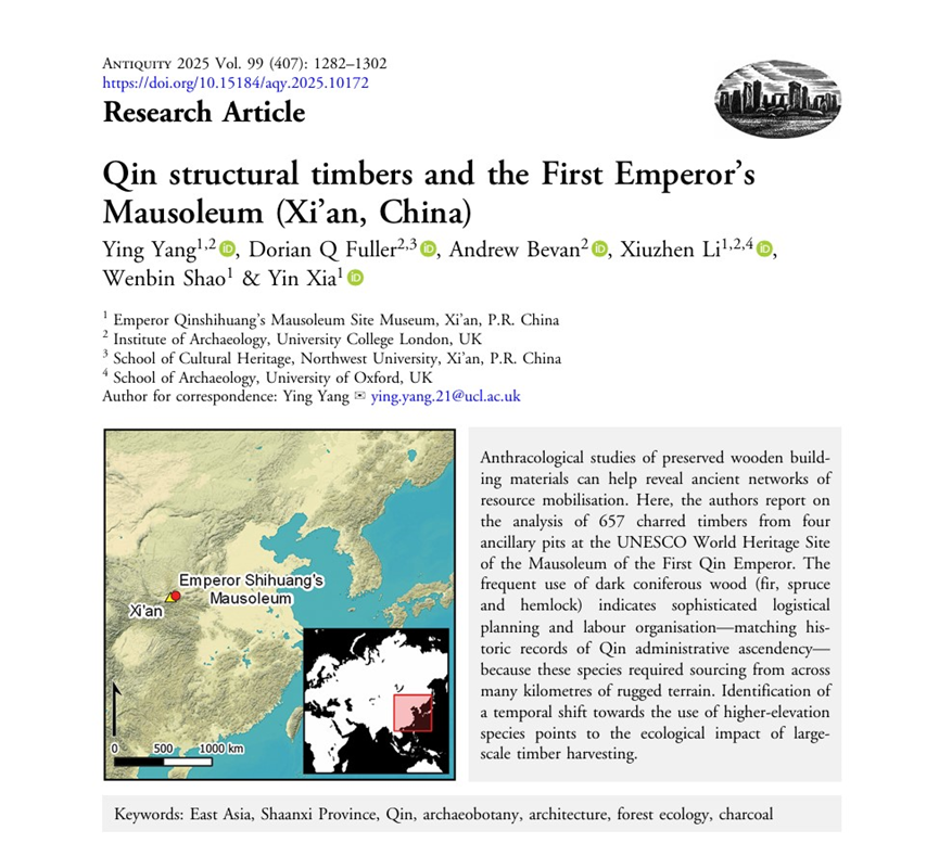 近日,秦始皇帝陵博物院与英国伦敦大学学院在国际权威考古期刊《Antiquity》上联合发表的一项研究,首次系统揭示了秦陵木质建筑的用材之谜,为理解秦帝国庞大的资源动员体系提供了全新实物证据。