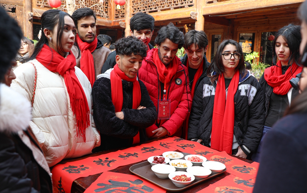 来自摩洛哥、孟加拉国、尼泊尔等13个国家的30余名外籍师生齐聚四川阆中古源堂,参与春节饮食文化体验活动。从包饺子到吃团年饭,他们在制作与品尝中,深入理解食物背后中国人对团圆、美满的朴素愿景。(苏苗苗/摄)