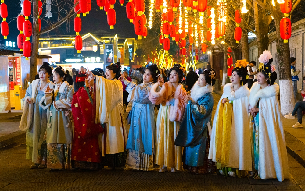 年轻人正在重新定义年味仪式感。在四川南充阆中古城,汉服爱好者穿行于青石长街,在窗花、灯笼映衬下留下新春第一组国风打卡照。当传统衣冠遇上传统节日,古韵也成了新潮。(王博硕/摄)