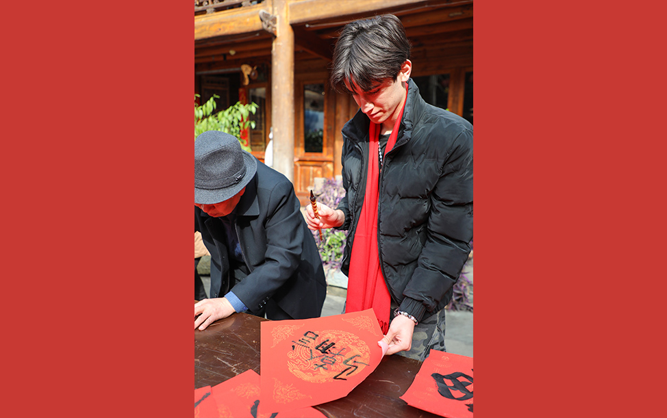 在四川南充阆中,来自阿富汗的留学生哈基穆拉赫(右)拿起毛笔,在春联上写下自己的中文名字“马翰言”。他选择在春联上落名,既是体验春节习俗,也寄托了对即将到来的农历马年“一马当先、万事顺意”的期盼。(苏苗苗/摄)