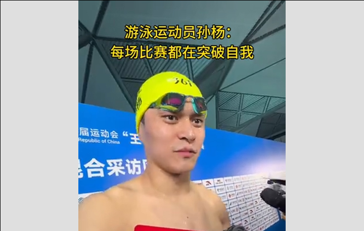 孙杨在第十五届全运会中再次展现竞技状态,受访时表示“每场比赛都在突破自我”。