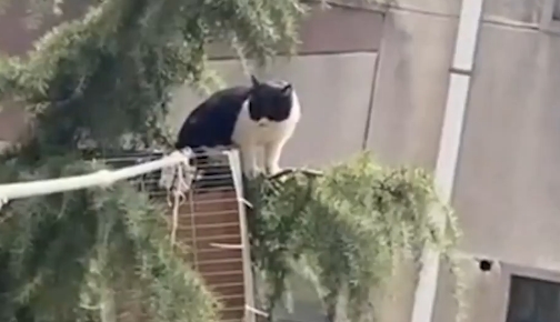 流浪猫被困树梢一天一夜,居民自制长杆解救
