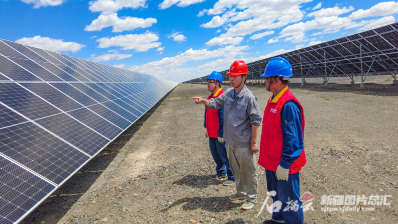 ▲7月11日,国网新疆电力有限公司奎屯供电公司员工在光伏发电场了解设备运行情况。徐晨 摄