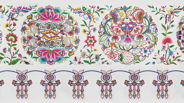自那以后,杨华珍开始注意到文博IP授权的商业潜质。通常,她都会根据品牌的需求和定位,结合藏羌织绣的艺术,为产品量身定做一款设计:“每一次创作都代表我的心。”比如杨华珍提取出藏羌织绣中的自然元素为某化妆品牌设计了两款具有深远寓意的藏羌织绣图案——“source of life(生命之源)”与“external youth(青春不朽)”,分别刻制在瓶身包装上。