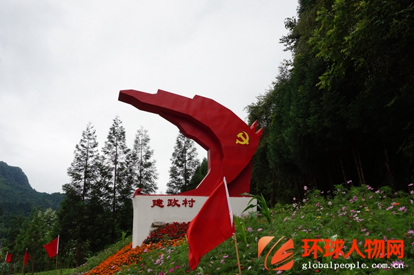 道路两旁,鲜艳的国旗随风飘动。如今的建政村,树林阴翳、景色秀丽,但地势依旧崎岖,很难想象当年红军是如何迎着满途荆棘开辟出前进道路。