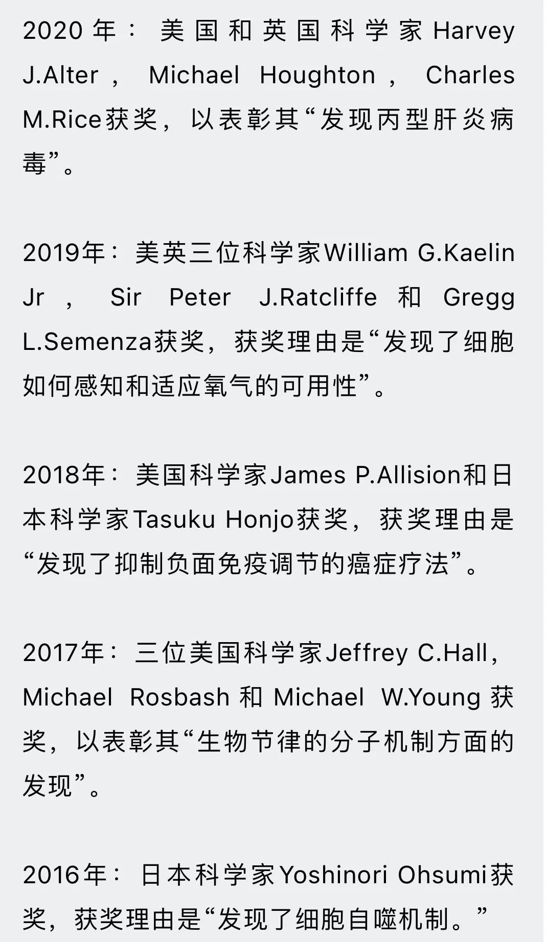 再看看最近5年生理学或医学奖的得主情况: