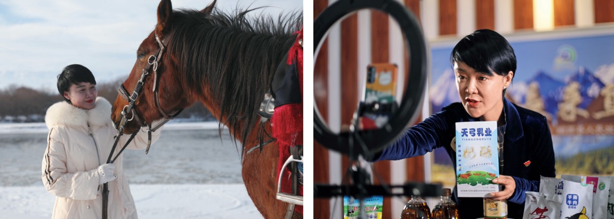 左图:贺娇龙同心爱的伊犁马在一起。右图:贺娇龙在直播“带货”。