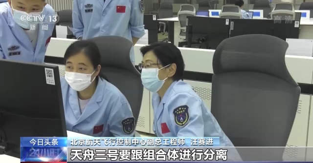 北京航天飞行控制中心副总工程师 汪赛进:我们7月4日刚完成针对“问天”发射进行的调相控制,随着“问天”发射的临近,正在策划的就是天舟三号的离轨相关工作,在这之前还要利用天舟三号进行变轨,之后在“问天”发射前,天舟三号要跟组合体进行分离。