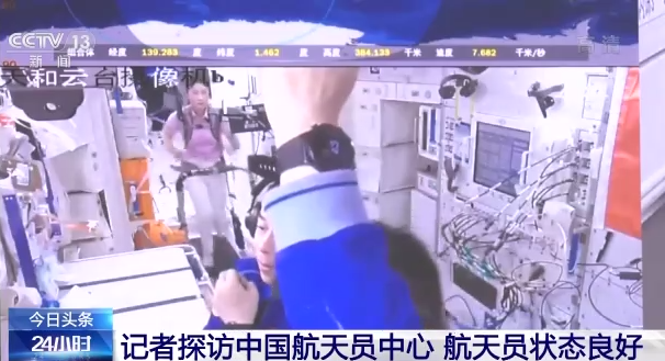 总台央视记者 刘冠青:这里是中国航天员中心航天员支持大厅,我们在屏幕上看到航天员刘洋正在利用太空跑台进行在轨训练。