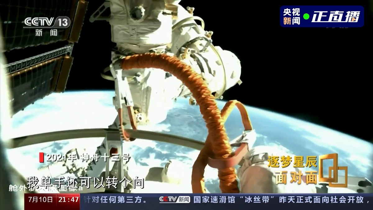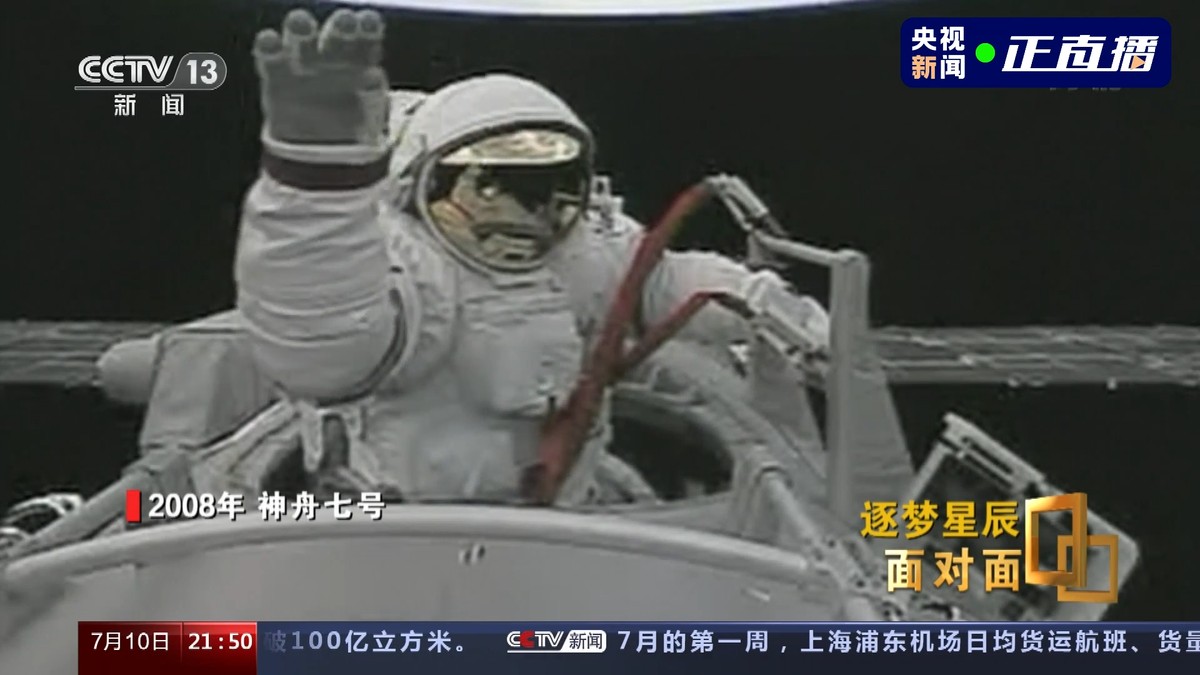 翟志刚:我以前都是双手扶着,我现在改单手扶着了,我单手还可以转个向,第一次出舱任务就是人能出去,能够简单爬行,把舱外的东西拿回来人再回来,神七任务就圆满成功了。现在再出舱,就跟我们第一次出舱完全不一样了。