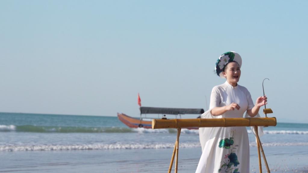 赵霞在广西东兴市金滩海边进行京族独弦琴表演。(受访者供图)