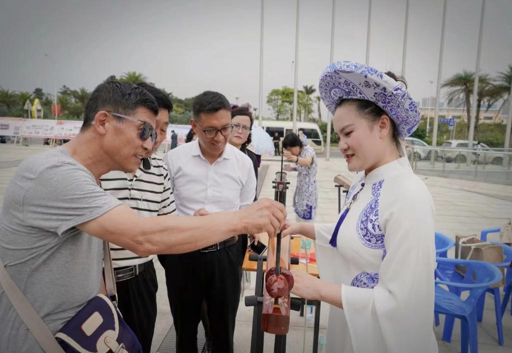 赵霞(右)在展示京族独弦琴。(受访者供图)