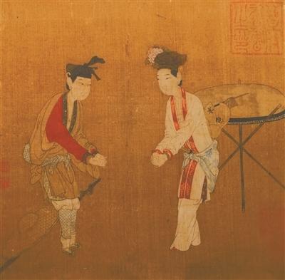 展览中另一幅绢本册页《打花鼓图》上仍是两人。右侧一人头戴大朵簪花,背插一扇,上书“末色”二字,扇从中一分为二,身后一架大皮鼓,鼓面上放演出道具。左侧男子打扮,身下放斗笠木杖,两人互视,拱手作揖。别看只是两幅小画,却透露出重要的社会信息——