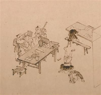 其实孩子并不总在玩耍,更多时间在上课。“扬州八怪”之一华喦所绘《桐屋闹学图》刻画了三个在教舍内打闹的孩子。教书先生趴在讲台上呼呼睡去,一个孩子戴着面具,手持短戒尺,与另一个挥舞长板子的孩子对峙。另一个学童从院子里摘来一朵花,偷偷插在伏案的先生的头巾上。屋前桐叶以“墨骨法”写出,淋漓繁茂。从两棵树中间可以望到一名乖孩子老实地坐在书桌前,似乎充耳不闻别人的事,一心只读圣贤书。无独有偶,明人张宏《杂技游戏图卷》中也描绘了孩童大闹学馆的情景。两个小孩在倒立,三个小孩围住酣睡中的老先生,一个准备用细绳套住他的帽子,另一个上了桌,抄起毛笔偷着给老师画黑眼圈。第三个孩子也戴着面具,双手抱着长板子。剩下的那个在写毛笔字的好孩子不由得回头观瞧。与华喦相比,张宏此图显得更加活泼生动。