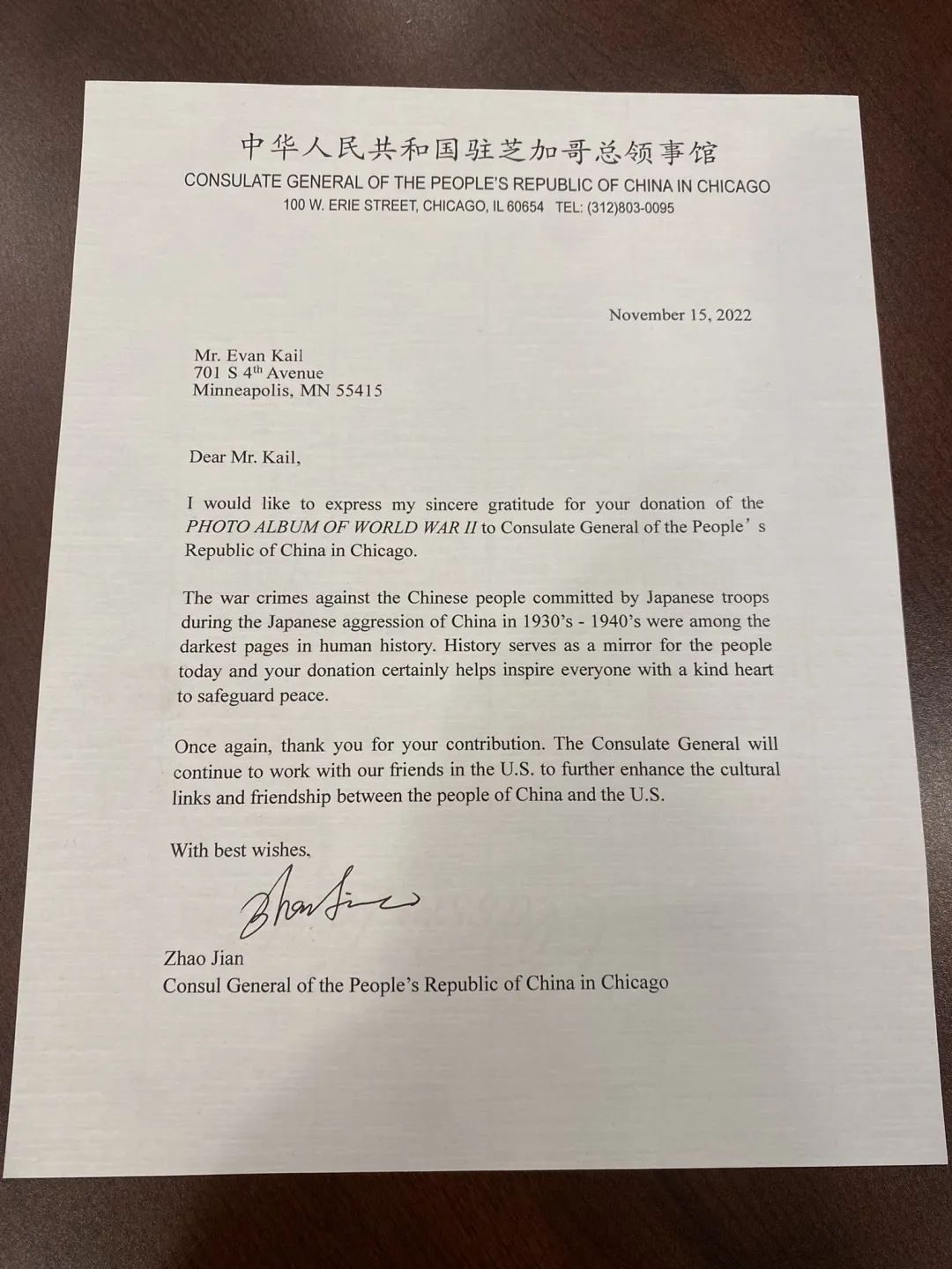 中国驻芝加哥总领事馆也回赠了埃文一封感谢信。领事馆在信中向埃文表达了诚挚的感谢,感谢他将这本二战相册捐给中国驻芝加哥总领事馆。