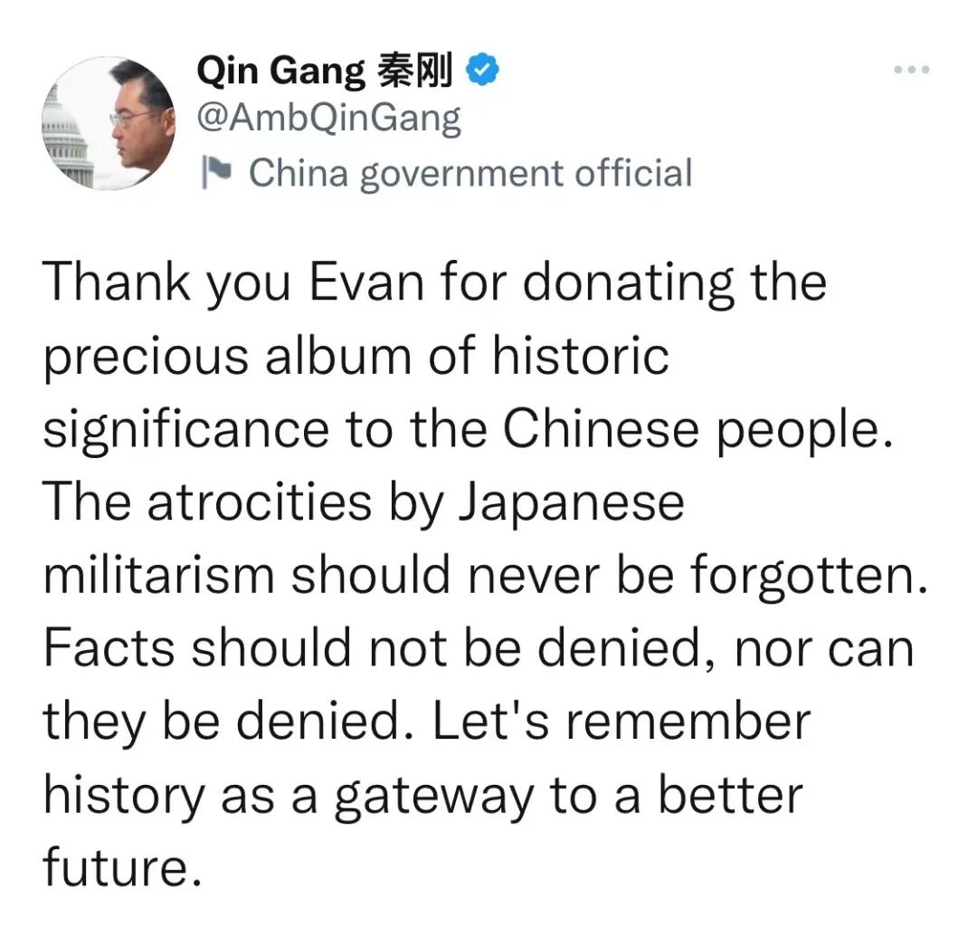 中国驻美国大使秦刚17日在社交媒体发文说,感谢埃文向中国人民捐赠这本具有历史意义的珍贵相册。“我们决不能忘记日本军国主义的暴行。事实不应该被否认,也不能被否认。让我们牢记历史是通向更美好未来的大门。”