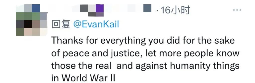 有网友说:谢谢你为和平与正义付出的一切,这让更多的人了解了二战期间发生过的那些反人类的卑劣行径。