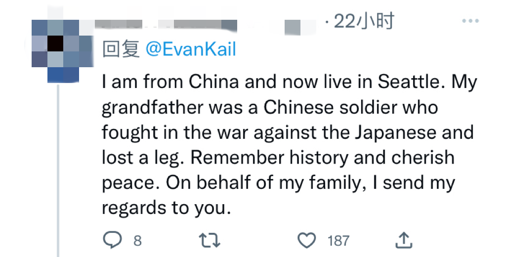 另一位网友表示:我是一名中国人,现住西雅图,我的爷爷曾在抗日战争中失去了一条腿。一定要铭记历史、珍惜和平,我代表我的家庭向您致敬。