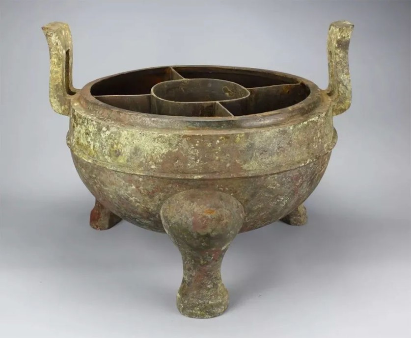 2009年,江苏盱眙县境内大云山西汉墓出土一件分格鼎,与如今的九宫格火锅异曲同工。鼎内布有5个错落有致的小格子,中间圆格外面再分出4格,既方便有酸、辛、咸等不同饮食习惯的食客,又能让鸡鸭鱼肉放在不同格子内避免串味,一锅顶五锅。