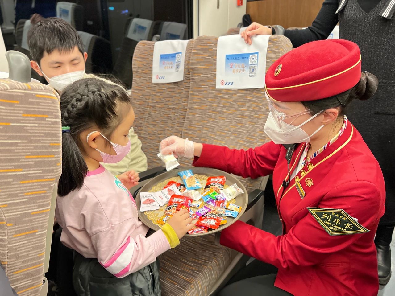 2023年1月19日,G39次北京南站开往杭州东站的列车上,常哲心在给小乘客发放糖果。受访者供图