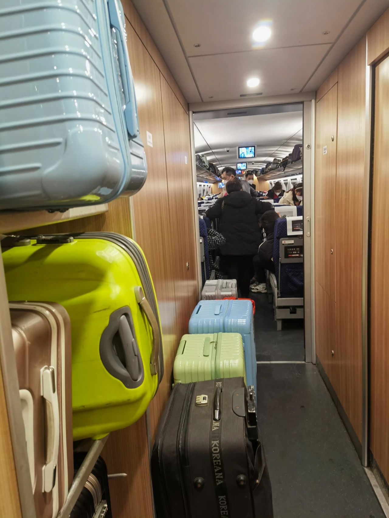 2023年1月10日,上海开往成都的一辆动车上,过道被行李占满。新京报记者 李照 摄