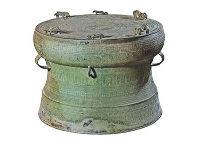 《后汉书·马援传》记载了铜鼓的故事。伏波将军马援一生铁马金戈,南征交趾时,得骆越铜鼓,将其熔铸成骏马献给皇帝。由此,唐宋以后,两广地区若出土铜鼓,便被附会为马援的遗物,称“伏波鼓”。后人会在寺庙供奉铜鼓,以求风调雨顺、国泰民安。顺便一提的是,寺庙中的风雷鼓,由敲击的轻重缓急不同,可以模拟风、雨、雷、电之声,配合早课的引磬、云板,又与钟声相呼应,演绎的是晨钟暮鼓的警觉醒悟。海南的文昌、万宁等地,现在仍有铜鼓地名。若鼍鼓是初始的正统之音,那后世的铜鼓则更增豪迈,集乐器、神器、重器为一身,饱含着丰饶富庶的祈愿。