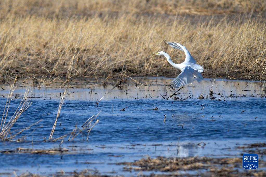 3月28日,在吉林省白城市镇赉县,一只大白鹭在湿地栖息。新华社记者 张楠 摄