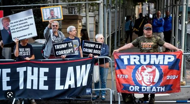·特朗普的反对者(左)和支持者(右)在纽约展示本方标语。