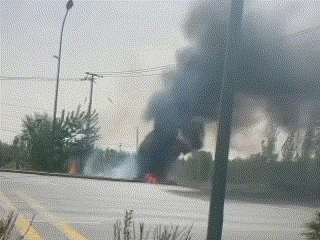 ▲车祸现场,白色轿车因车速过快撞向限宽墩发生侧翻,现场浓烟滚滚,车辆起火。