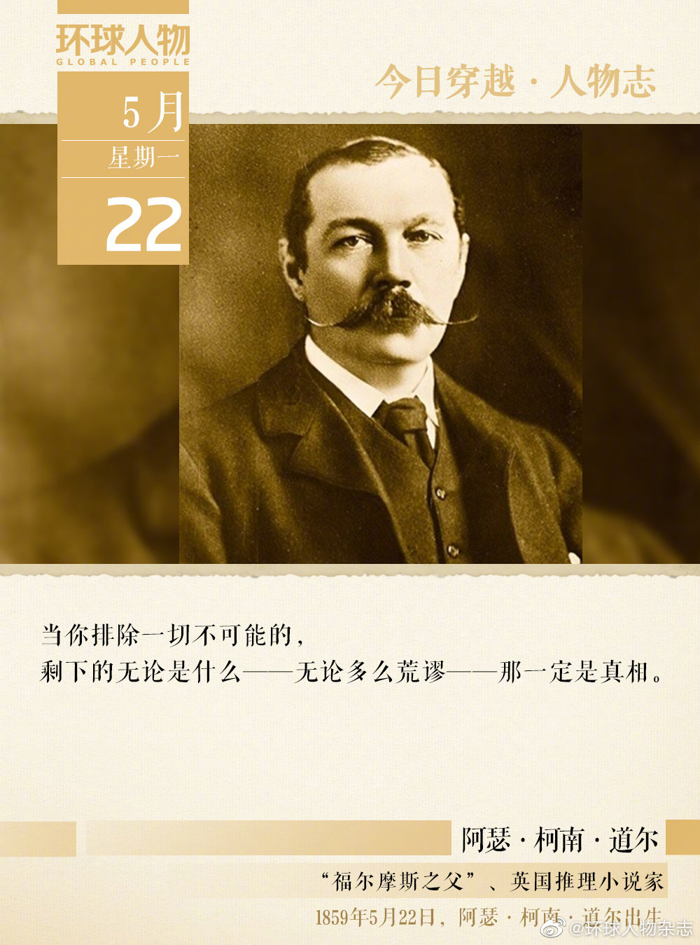1859年5月22日,福尔摩斯的创造者柯南·道尔出生。柯南·道尔原为医学生,从医期间进行写作,第一部重要作品《血字的研究》的主角正是福尔摩斯。此后,其笔下的神探夏洛克·福尔摩斯风靡世界。柯南·道尔一生共创作了60个福尔摩斯故事,包括56个短篇和4部长篇,开辟了侦探小说的“黄金时代”。如今,在英国伦敦的贝克街上,依然竖立着福尔摩斯的雕像。在福尔摩斯的众多故事中,哪个最令你痴迷?
