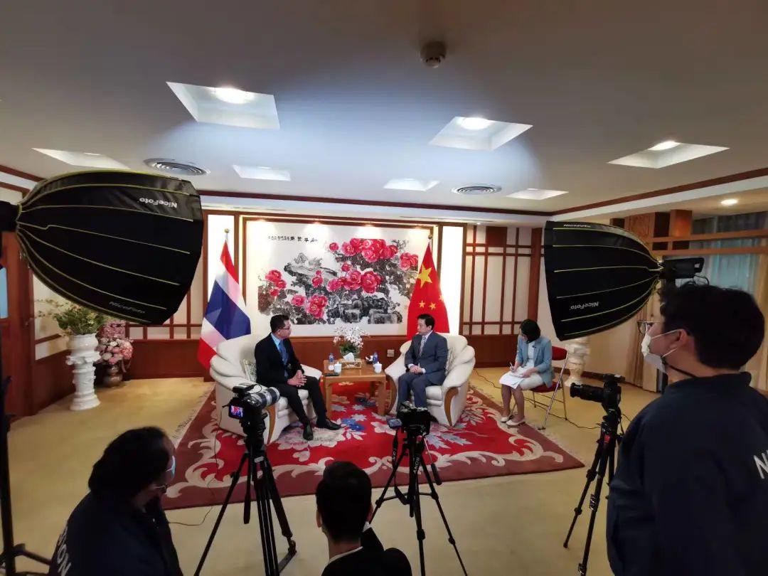 ·奇布(左)采访中国驻泰国大使韩志强。