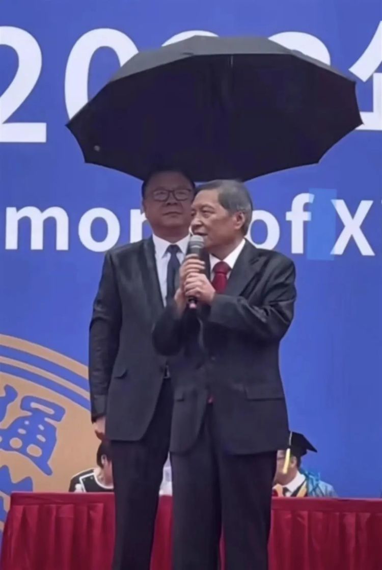 西安交大党委书记前来为校长撑伞遮雨,校长在台上客气推辞,温馨一幕引来台下暖心笑容 来源:视频截图