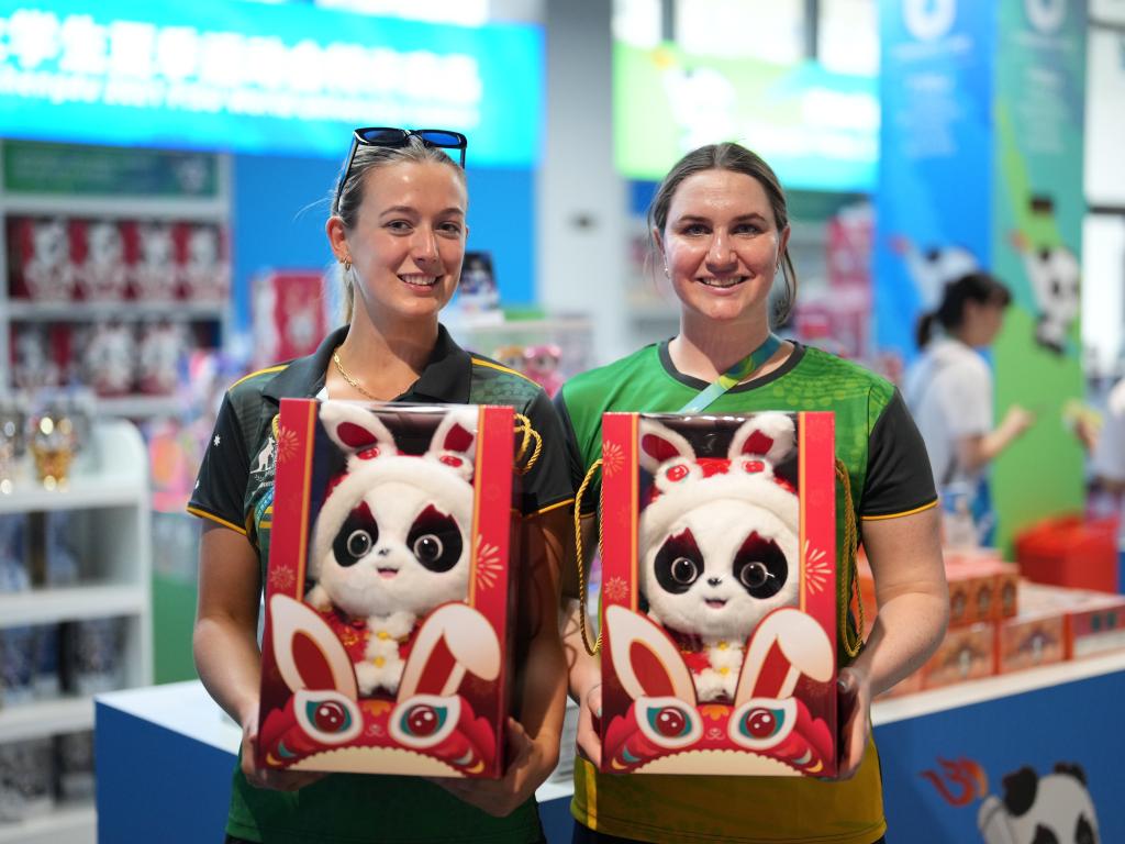 苏珊(左)和队友展示刚刚买到的兔年版“蓉宝”。新华社记者 郑直 摄