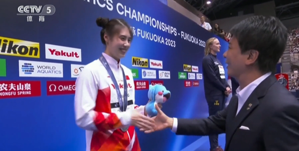 赛后,张雨霏换上“哪吒”造型的发型,登上了领奖台。