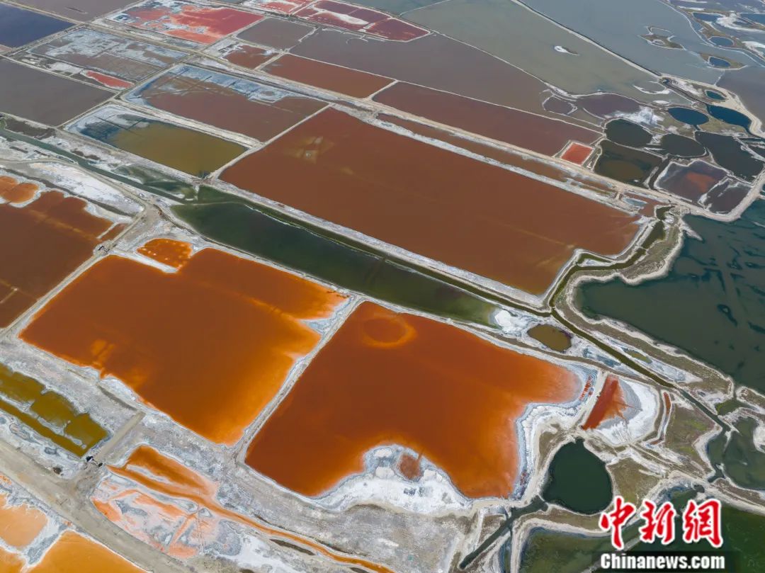 山西运城,航拍盐湖宛如七彩调色盘,色彩斑斓美不胜收。武俊杰 摄