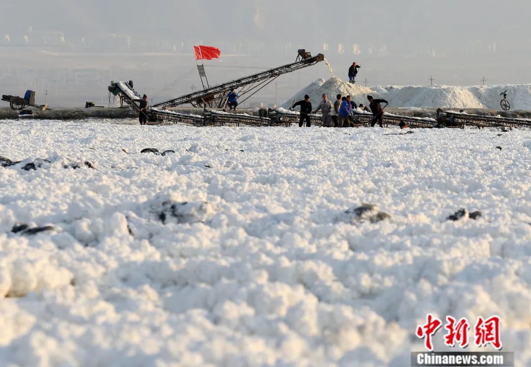 2019年1月,在山西运城130多平方公里的盐湖上,工人们采用人工加机械的方式收芒硝。姜 华 摄