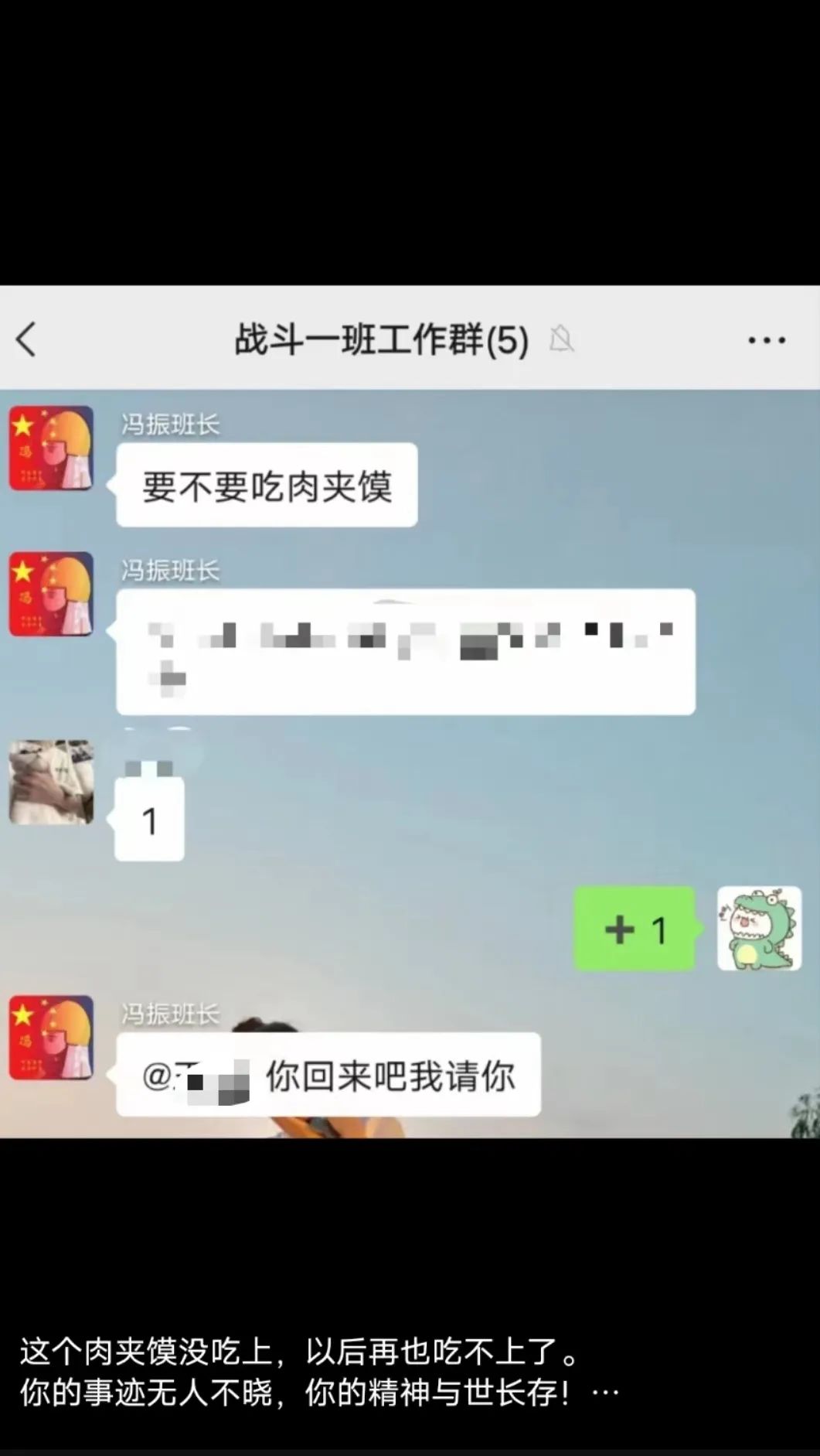 “平时特别乐呵的一个人,突然就没了,好多战友都不能接受。”战友透露,冯振曾在一个工作群中问“要不要吃肉夹馍”,还对一个战友说“你回来吧我请你”。冯振牺牲后,这名战友发文表示:“这个肉夹馍没吃上,以后再也吃不上了。”