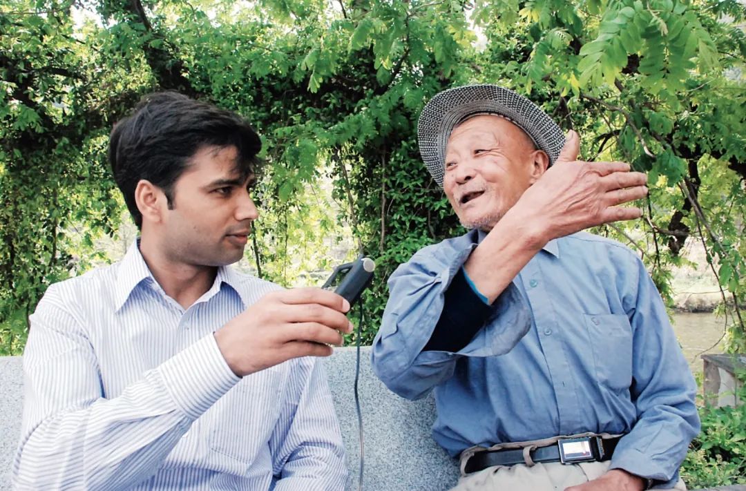 ·魏汉和中国的老大爷交谈。