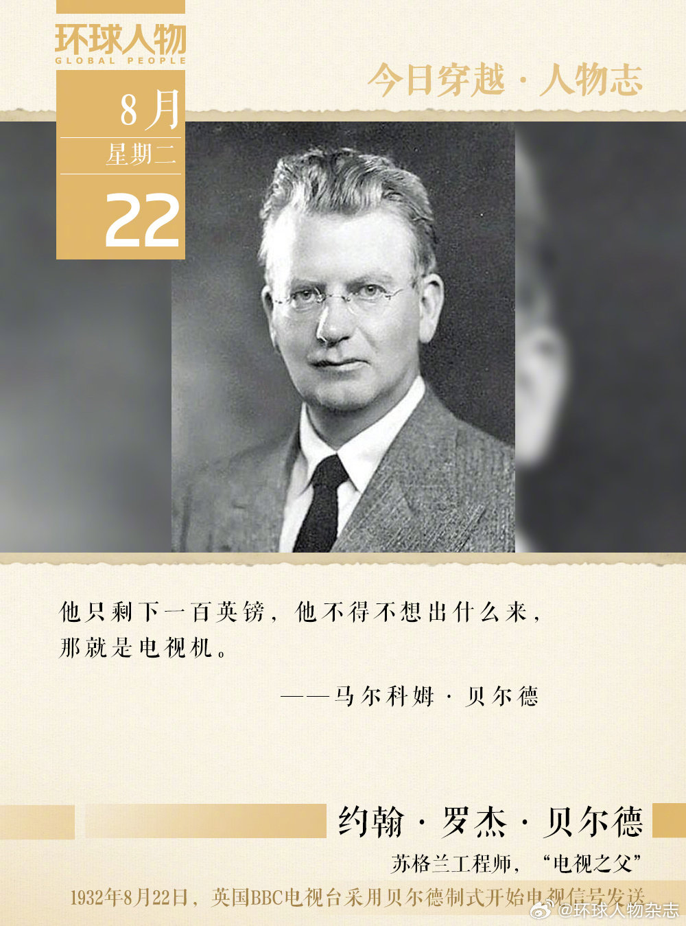 1923年,贝尔德决心要完成“用电传送图像”的任务。他将自己仅有的一点财产卖掉,收集了大量资料,并把所有时间都投入到研制电视机上。经过数年努力,1932年8月22日,约翰•罗吉•贝尔德与英国广播公司(BBC)合作开始常规电视转播。1936年11月2日,BBC开始了全球第一个电视播送服务。他也被英国广播公司(BBC)选为最伟大的100名英国人之一。