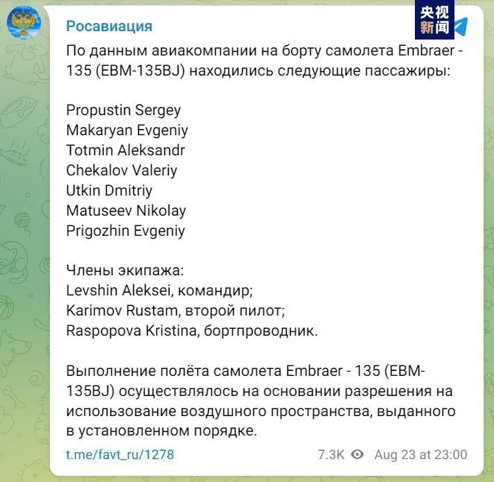 报道称,7名乘客包括叶夫根尼·普里戈任、德米特里·乌特金(瓦格纳联合创始人)、谢尔盖·普罗普斯汀、叶夫根尼·马卡良、亚历山大·托特明、瓦列里·切卡洛夫、尼古拉·马图耶夫。