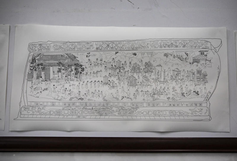 8月17日,助理馆员张航正对着漆画同比例影印图找寻漆片原本的位置。新京报记者王远征摄