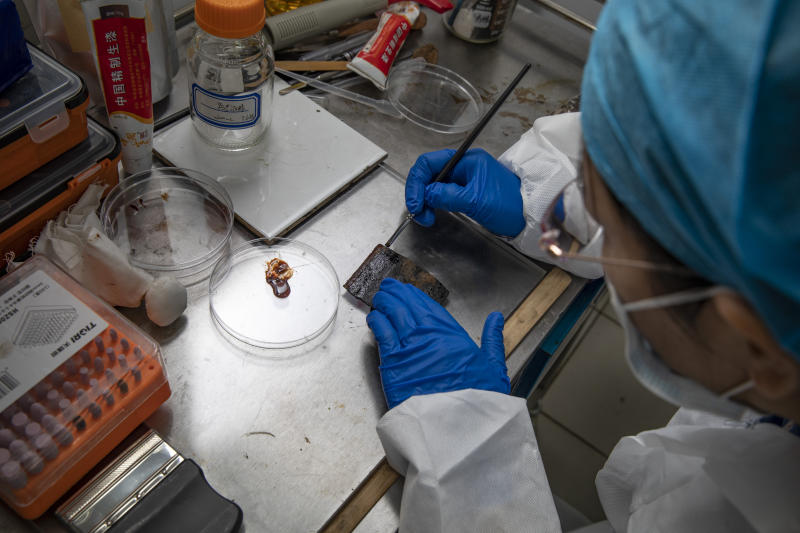 等到玻璃房建起来后,他们发现随着氧气含量突增,温度适宜,潜伏在棺椁中,休眠的霉菌虫害重新滋生繁衍,黑色、白色的虫子绕着棺椁满天飞,菌类快速生长,顶开了木材上的漆,他们请中国林业大学的老师帮忙做分析,了解到这些菌类都是“吃木头”的。他们开始用棉签和脱脂棉球一点一点清理表面的霉菌,给漆棺“打点滴”,将抑菌药物渗入到棺木的每一分纹理;用镊子、手术刀把露出表面的根系,一点点地、像动手术一样地取出来。他们用了2年时间清除植物根系,最后清出的根系有满满两大箱。