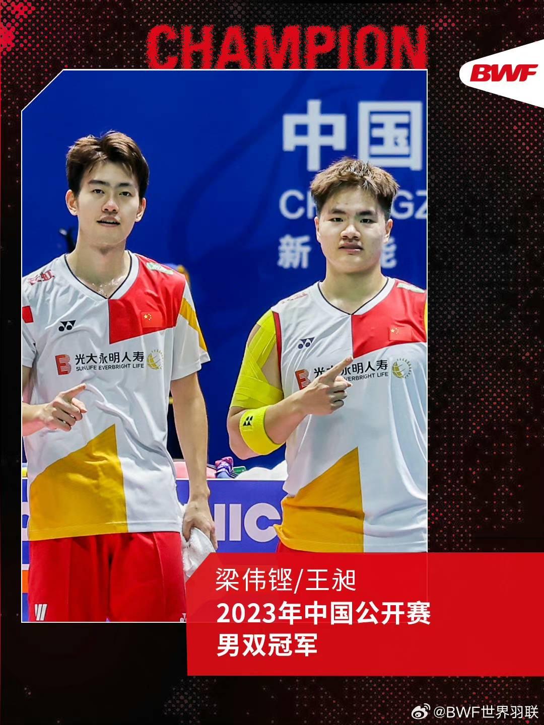 9月10日,2023中国羽毛球公开赛在常州展开各单项决赛争夺。刚刚结束的男双决赛,中国队年轻组合梁伟铿、王昶以2-0击败马来西亚队组合谢定峰、苏伟译夺得冠军。国羽男双时隔22年再夺中国公开赛冠军,恭喜!