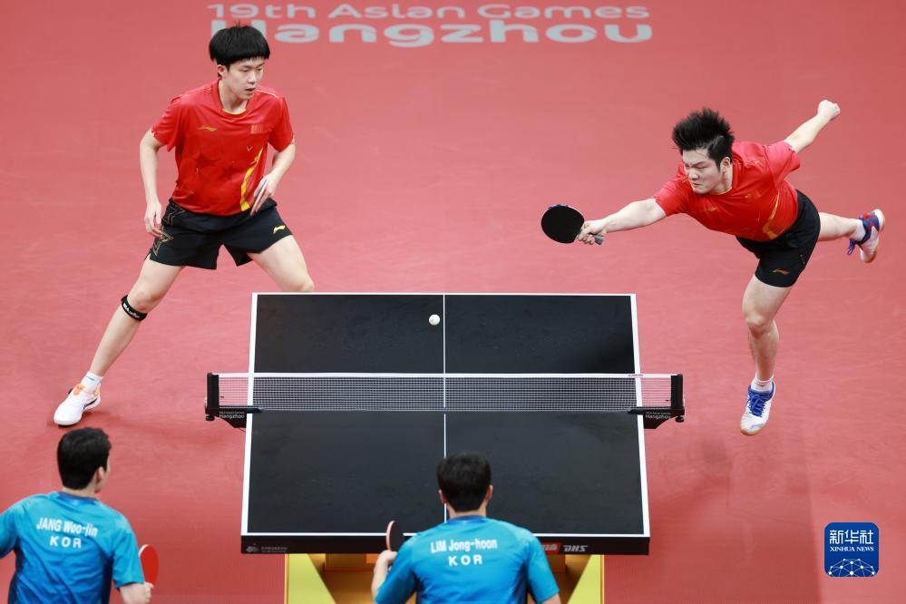 当日,在杭州亚运会乒乓球项目男子双打决赛中,中国组合樊振东/王楚钦以4比0战胜韩国组合张禹珍/林钟勋,获得冠军。