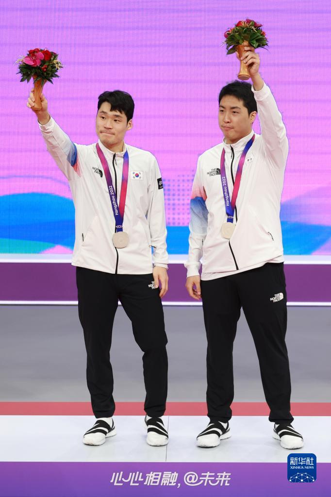 10月1日,获得亚军的韩国组合张禹珍(左)/林钟勋在领奖台上。